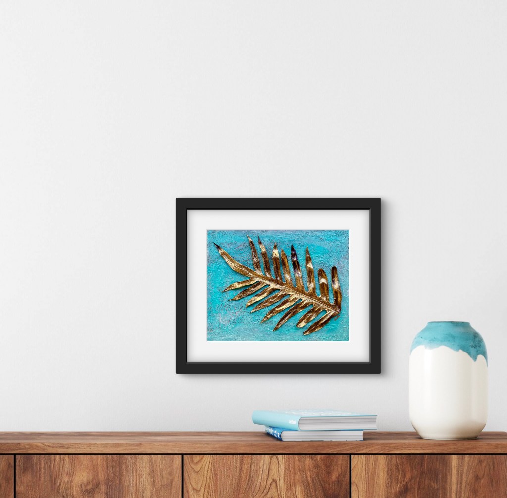 My latest artwork features a stunning single Laua’e fern leaf, elegantly painted in gold and black against a serene blue background.