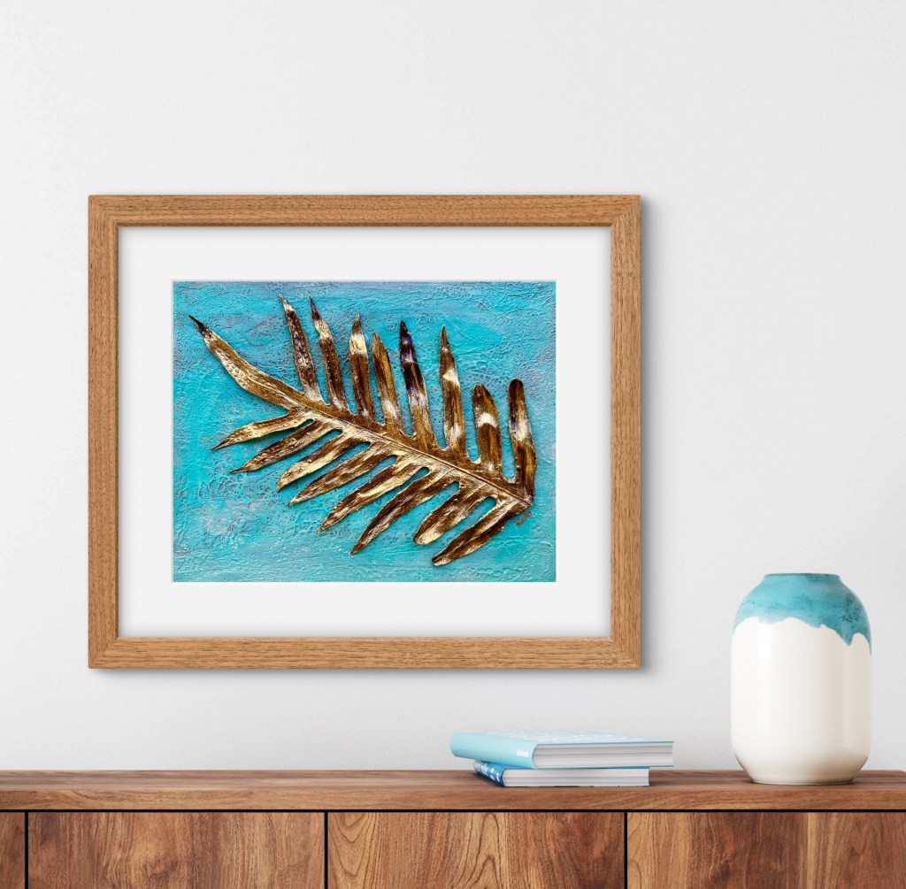 As you gaze at the canvas, you will be captivated by the harmonious blend of deep gold and soft blue. These colors invite you into the tranquil atmosphere of the valley, while the intricate patterns of the fern highlight the beauty found in everyday details. This piece encourages you to pause and appreciate the often-overlooked wonders of nature.