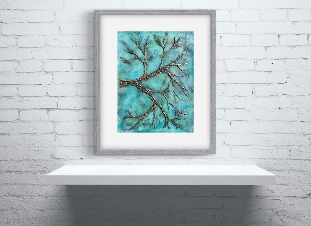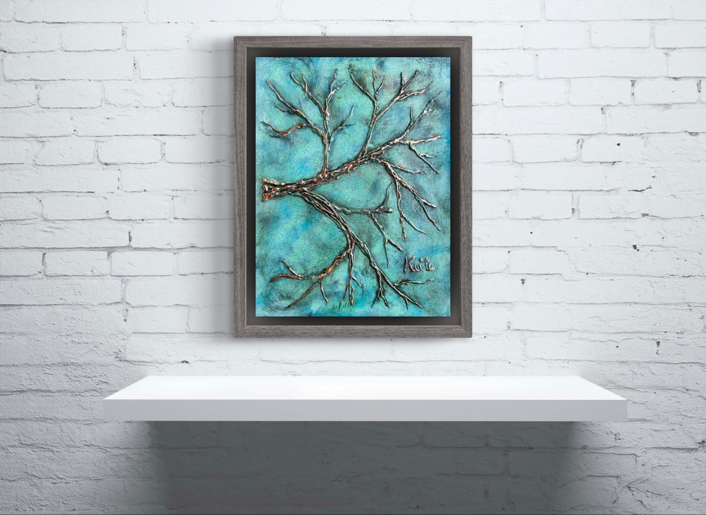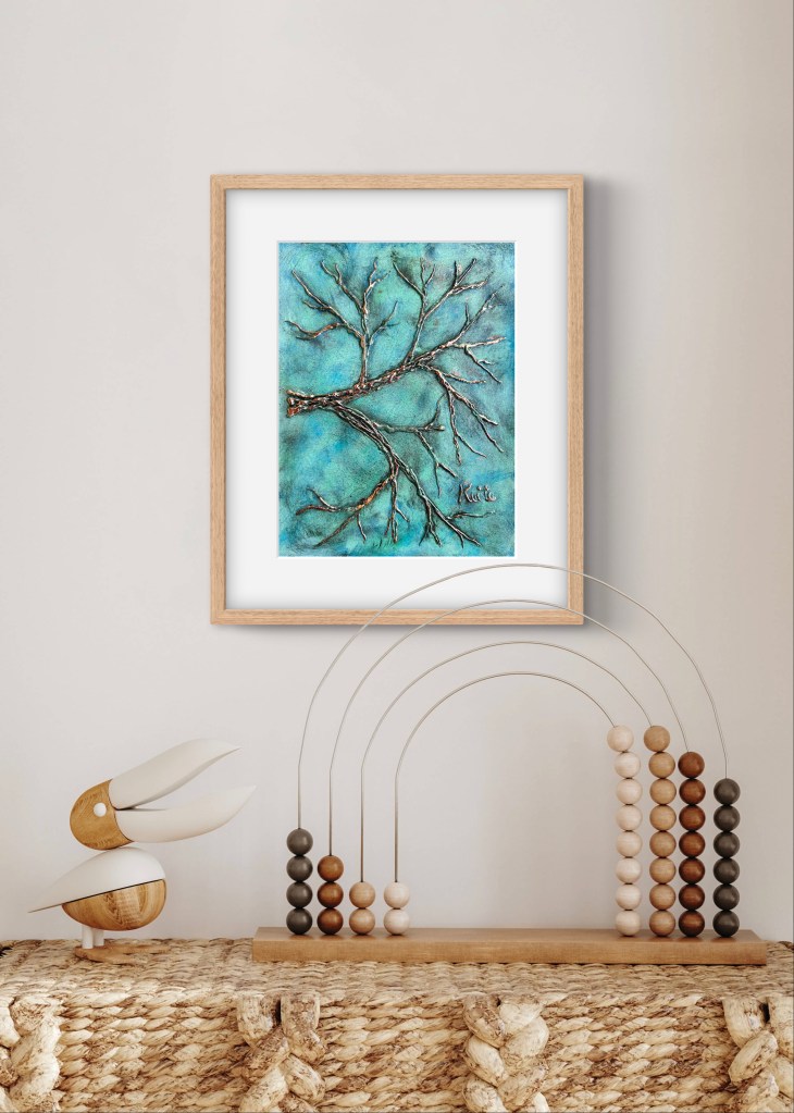 The serene blue background, painted in acrylic, resembles a clear sky that ignites inspiration and encourages viewers to delve into their own emotions and aspirations. As the branches reach upward, the gold leaf catches the light, reminding us that we can shine even in difficult times. The gold represents hope and success, demonstrating that our dedication to pursuing our passions can yield remarkable outcomes.