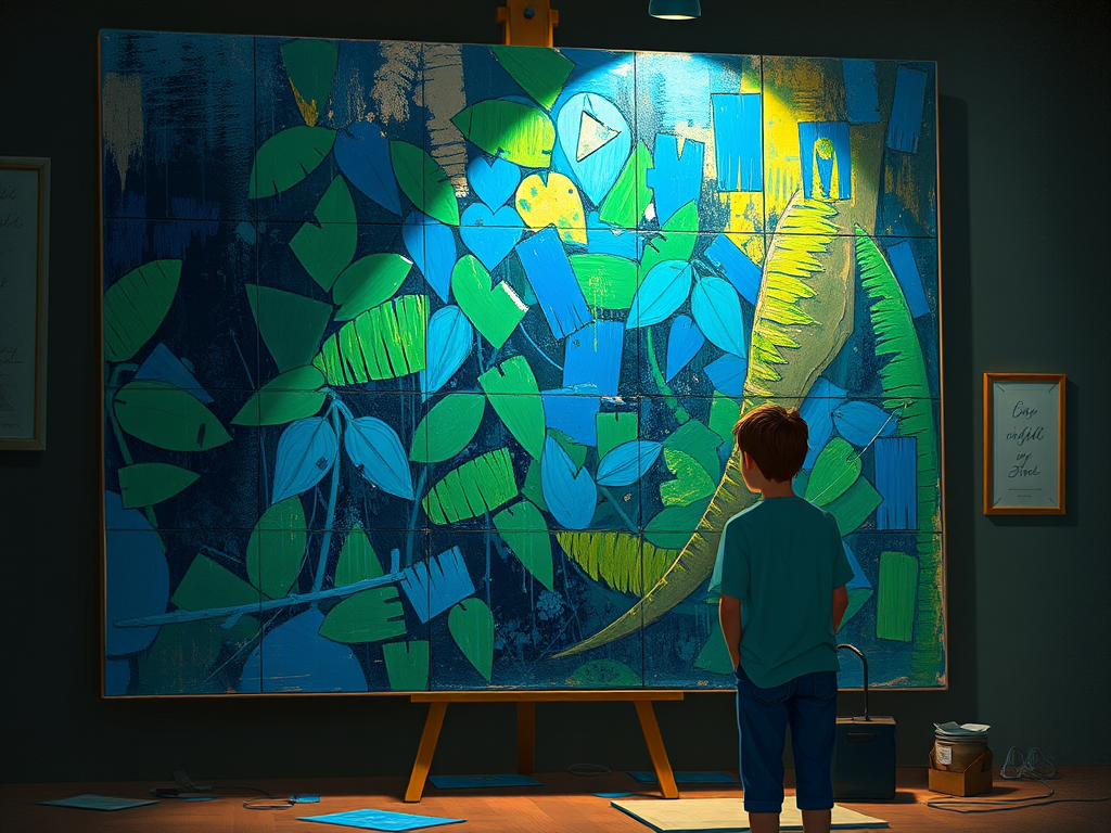 Picture yourself in front of a vibrant canvas, with each color calling you in. Those deep blues feel rich and mysterious, inviting you to dig into the emotions and stories hidden within. Then, as you look closer, that vibrant green pops out, bursting with life and possibilities. These colors bring a sense of hope and energy that really hits home, stirring something inside you.