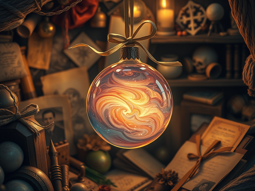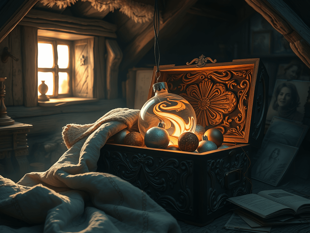 Inside, she found a jumble of trinkets—old photographs, letters tied with faded ribbons, and a collection of ornaments unlike any she had ever seen. Among these, one ornament caught her eye. It was a fragile glass bauble with swirling colors that shimmered like a winter sunset. Intrigued, Lily lifted it closer to the light, and as she did, a rush of warmth enveloped the attic, filling it with the scent of pine and spices.