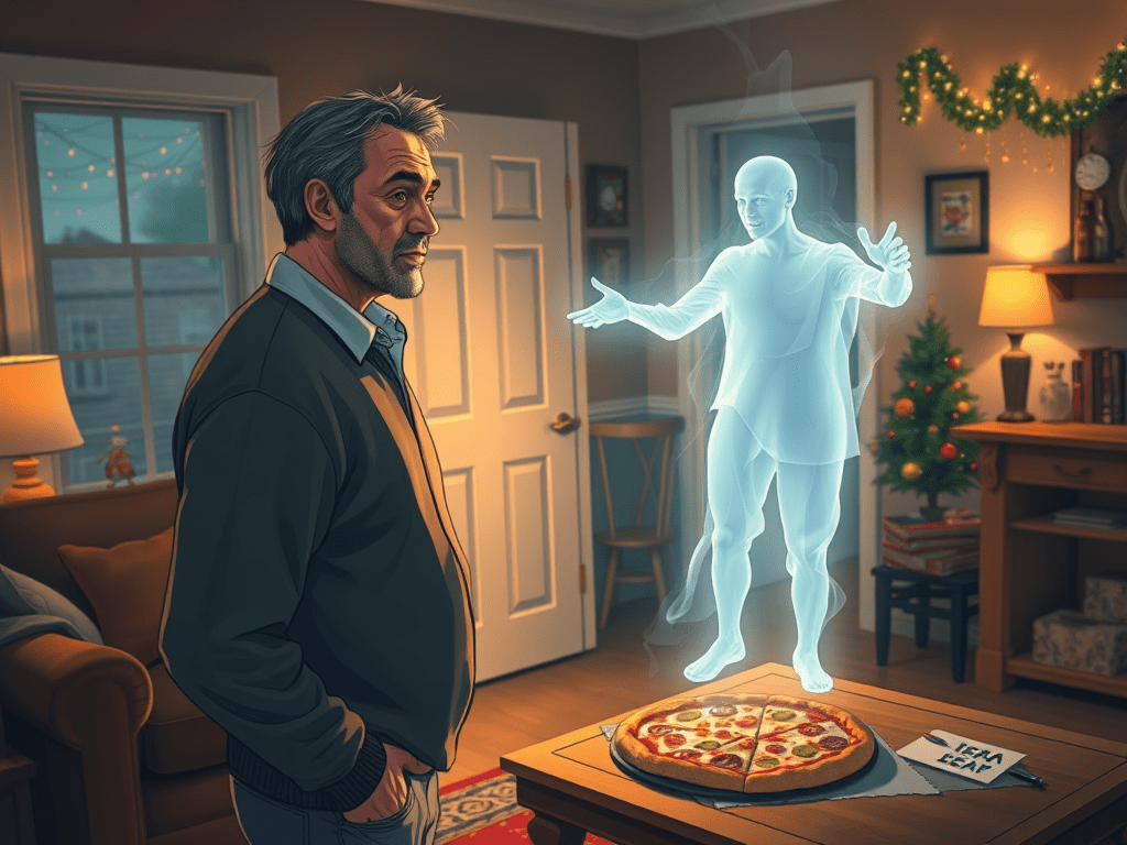 Finally, when the clock struck ten, a soft knock echoed through his apartment. He jumped, puzzled. “Who could that be?” With a shrug of resignation, he opened the door, and there stood a flickering figure, glowing with an ethereal light that made him squint.